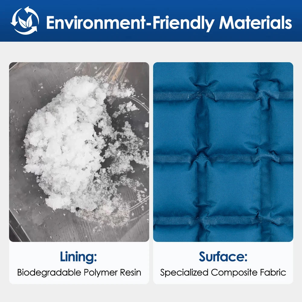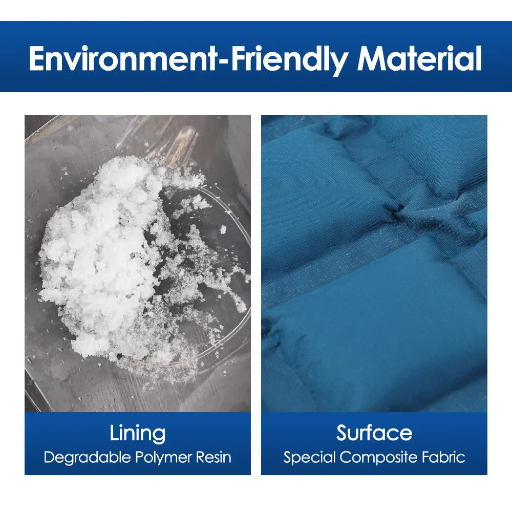 The water-activated polymer resin core absorbs water quickly and locks it into a slushy, freeze-ready structure. Because it ships dry, the wrap arrives lightweight and compact. Soak it to activate, and it expands into a full-size reusable compress ready for freezing or heating.